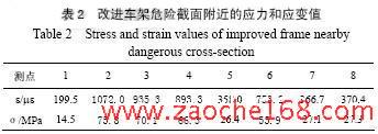 为了对改型后的车架进行验证,在如图5 所示的位置布置了8 个直角应变花,对车架危险截面位置附近进行了应力应变测试,对数据分析处理得到这8 个测点的应力应变值如表2 所示。