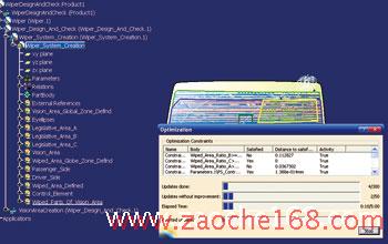 雨刮器系统流程模板的使用流程分7个步骤,主要包括导入建模所需几何条件,建立空的设计零件文档,创建理论风窗A、B、C区,创建实际风窗A、B、C区,校核分析、优化参数及输出结果报告。雨刮系统校核流程模板优化分析及校核流程模板程序提示见图5、6。