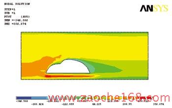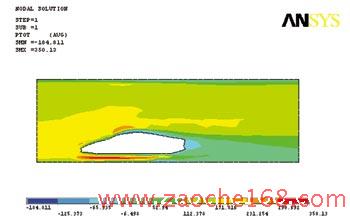 由于本文所使用的是ANSYS教学版软件,在计算规模上有很大限制,因此对计算模型进行了必要的简化,考虑汽车结构的对称性,在忽略侧风等非对称性因素的影响,考虑汽车的对称面,同时对车底、车头等部位均进行了必要的简化,建立了平面有限元模型。使用ANSYS软件的2D FLOUNT 141单元进行离散,用有限元的二维分析模型进行求解。