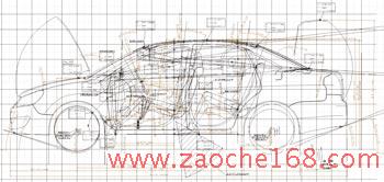 在前面总布置草图的基础上,细化总布置设计,精确地描述各部件的尺寸和位置,为各总成和部件分配准确的布置空间,确定各个部件的详细结构形式、特征参数、质量要求等条件。主要的工作包括:发动机舱详细布置图、底盘详细布置图,内饰布置图、外饰布置图以及电器布置图(如图7)。