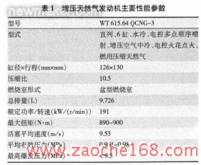 试验机型是以潍坊柴油机厂生产的WT615型柴油机为基础研制的电控增压单一燃料压缩天然气发动机。该天然气发动机主要性能指标和结构参数见表1。