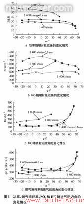 本实验分别在1400r/min和1800r/min,调节喷射延迟角,测量发动机的功率、燃气消耗率,NOx和HC,结果如图1所示。
