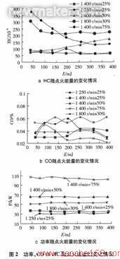 在点火能量的试验中,分别选取1250r/min,1400r/min和1800r/min的转速,点火能量从41~400W,分析其对功率,HC和CO的影响情况,如图2所示,从图2中可以看出: