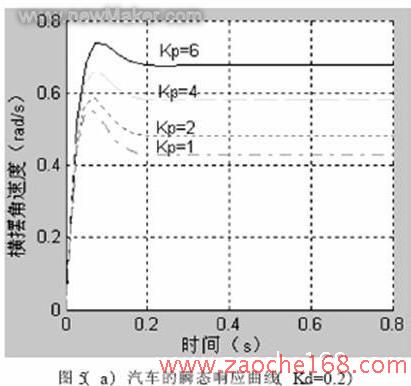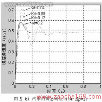 由图5(a)可以看出,当比例控制系数Kp减小时能很好的抑制系统的超调量;但是对系统的反应时间和稳定时间几乎没有任何影响;由图5(b)可以看出,Kd取较大值时,系统的超调量得到明显的抑制,且系统的反应时间和稳定时间均十分理想;但是随着Kd的减小,系统的反应时间增大,系统的阻尼系数逐渐变小,超调量增大,汽车的操纵稳定性明显的变坏。