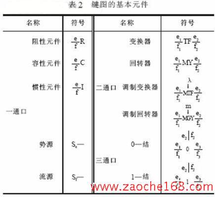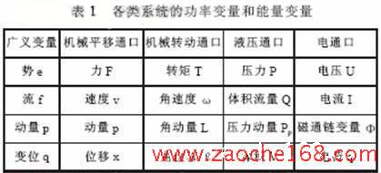 在每个系统中,相互作用的子系统之间有功率的传递,键合图以此为依据建立系统模型,系统间传递功率的地方即为通口;键合图中有4种状态变量为势e(t)、流f(t)、动量p(t)和变位q(t),通常我们把动量p(t)和变位q(t)称为能量变量,势e(t)和流f(t)称为功率变量。表1 给出了各种不同能量范畴的功率和能量变量。