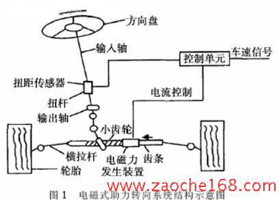 电磁式助力转向系统主要由转矩传感器、车速传感器、控制单元、电磁力发生装置等组成。在操纵方向盘时,控制单元根据转矩传感器输出的转向转矩信号及车速传感器输出的车速信号调节电磁力发生装置供电电流的大小,以获得适当的转向助力,从而保证车辆在任何工况下转向都有较理想的操纵稳定性和转向轻便性,即在原地操舵及低速转向轻便灵敏,在高速下转动方向盘不会丧失路感。