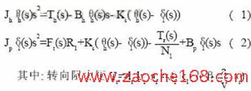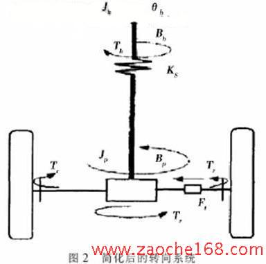 在建模过程中,我们把汽车简化为只具有侧向移动和横摆运动的线性二自由度的汽车模型;同时将转向系统的转向机构向转向柱简化,把系统中各构件绕其中心的转动惯量等效为绕转向柱的转动惯量,并以等效阻尼系数代替各连接铰或运动副的助力系数之和,转矩传感器可以看成是一个刚度为Ks的扭力杆。简化后的转向系统如图2中所示。