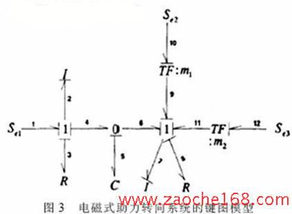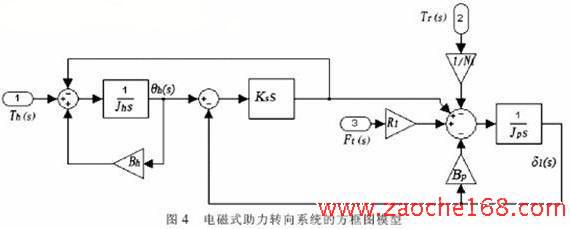 根据键合图元件与方框图的的对应关系,可由系统的键图模型建立出与图3相对应的汽车电磁式助力转向系统的方框图模型如图4。