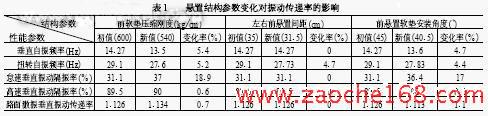 (2) 计算示例。以YBL 6980T 1K 车为例,对影响振动传递率的部分参数在分别变化10% 的情况下,定量地观察该车的振动传递率,详见表1。