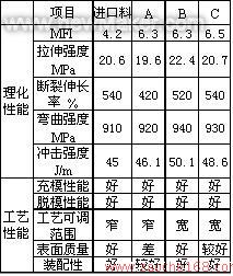 从表中可以看出我们研制的B、C配方材料性能全部达到进口料的标准(在相同的注塑条件下),其工艺性能和外观质量也达到了进口料的水平,而且工艺可调范围广。其中A--22号配方最好,结果比较理想。