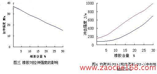 如图三所示,橡胶含量的增加,材料的拉伸强度逐步下降,当橡胶含量从0增加到30份时材料的拉伸强度由原来的35Mpa下降到16MPa,这主要是由于橡胶的加入,虽增加了材料的冲击性能,但同时也破坏了聚丙烯的高结晶性导致了强度的下降,当橡胶含量为30份时,屈服拉伸强度下降了50%。