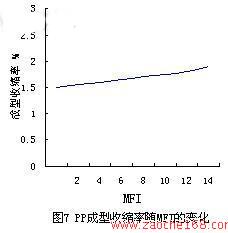 此外成型收缩率和PP分子量大小也有关系。当分子量增大时,PP的结晶度和结晶率都呈下降趋势,从而导致成型收缩率减小。而当分子量减小时,PP结晶速度和结晶率都增大,成型收缩率也随之增大,图7所示为PP成型收缩率随MFI的变化趋势。