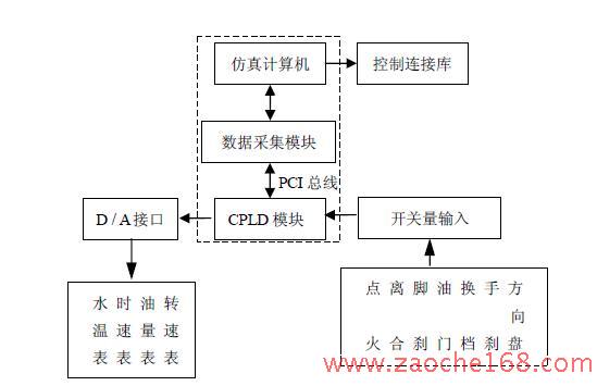 汽车驾驶模拟器系统包括机械部分、控制系统和模拟软件三大部分。机械部分的点火装置、方向盘、离合装置、脚刹装置、手刹装置、油门装置、档位装置、仪表装置均采用实物仿真;控制系统定时检测点火情况、方向盘转过的角度、旋转方向、离合器、脚刹、手刹、油门、档位的状态,并将检测的结果传送给计算机,通过模拟软件来变换驾驶的场景,同时,将当前的水温、时速、发动机转速和油量传送给控制系统,以改变仪表盘的指示。控制系统原理图如图1 所示。