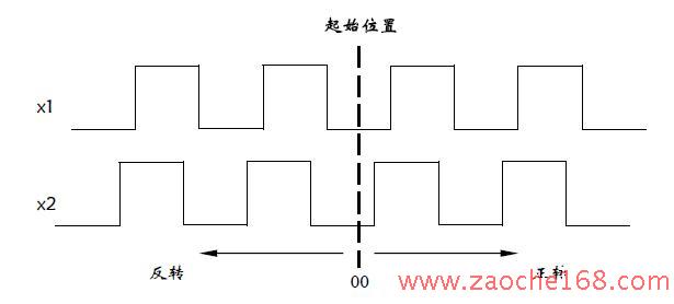 在实际设计过程中,要判断方向盘的转向以及转动角度,也就是说首先要判断左转还是右转,然后判断转的角度。方向盘的转动方向和转动角度示意图如图2 所示,选用两个光电感应开关JK122,安装在转盘旁边,x1 和x2 处为两个光电感应开关所放位置,当转盘转动时,有齿挡住光电感应开关,则输出为1,反之输出为0。