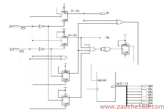 由此可见,假设x1、x2 的初始状态都为0,则正转时其状态变化为00—01—11—10—00, 而反转时状态变化为00—10—11—01—00。只要知道x1、x2 的当前状态和下一状态,即可知道此时方向盘的转向了。我们在设计时要判断好初始状态为00 这种情况。将x1、x2 信号分别接到两个T 触发器的输入端上,并将反向后的信号作为触发器的清零信号。当初始状态为00 时,两个触发器输出都为0,如果后一状态为01,则触发器T1 输出为1,表示正转;如果后一状态为10,则触发器T2 输出为1,表示反转。由于紧接着的状态肯定是11,所以触发器清零后,等到状态为00 又可以重新开始判断。判断转向后,还要判断转动的角度。在这里我们又加入两个T 触发器T3 和T4,当输入x1、x2 的状态从11 变化到10,触发器T3 输出为1,反之,如果从11 变化到01,触发器T4 输出为1。最后,将四个触发器的输出信号相或后作为时钟信号送到计数器中,并将T1、T3 的输出信号相或后作为计数器的输入信号,于是当方向盘正转时计数器向上累加,而反转时则向下递减,最后通过读出计数器的输出数据即可得知方向盘的转动角度。本文采用CPLD 技术设计控制电路,原理图如图4 所示。