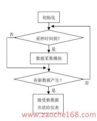 本系统软件部分由检测主程序、驱动仪表程序和方向盘等开关量输入程序组成。检测主程序包括数据采集模块、CPLD 模块,并且分配给仪表和开关量输入不同的端口。在端口的初始化中将所有初始状态设置为0,通过软件的定时器扫描,各端口的状态实时的传给主程序,其主程序流程图如图5 所示。