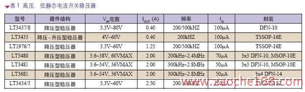 为了更好地控制这些需求,几家汽车制造商为始终保持接通的 DC/DC 转换器确定了 100mA 的低静态电流目标。直到最近,一直要求系统制造商给降压型稳压器并联一个低静态电流 LDO,每次汽车点火装置关闭后,都要从转换器切换到电流低得多的 LDO。这样的解决方案昂贵、笨重且效率相对较低。凌力尔特公司提供了 36V~60V 输入、<100mA 的降压型 DC/DC 转换器,如表 1 所示。能以突发模式(Burst Mode)工作的开关稳压器可组成紧凑得多、效率也高得多的解决方案,可解决始终保持接通带来的问题。