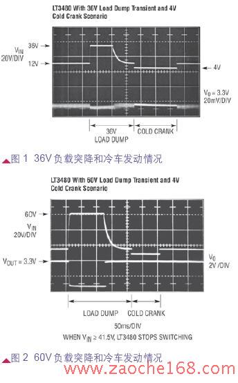 负载突降是交流发电机正在给电池充电而电池电缆断接时出现的情况。在汽车正在工作时电池电缆松动或汽车运转时电池电缆断裂,都可能发生负载突降情况。在交流发电机试图全力充电时电池电缆突然断接,可能产生高达60V的瞬态电压尖峰(见图1和图2中的36V和60V瞬态图形)。交流发电机上的瞬态电压抑制器通常将总线电压箝位在36V到60V之间,并吸收大部分浪涌电流。不过,交流发电机的下游器件DC/DC转换器要承受这些36V至60V的瞬态尖峰。由于这些转换器和由转换器供电的子系统在这种瞬态事件发生期间不能损坏,而且在某些情况下还要稳定输出电压,因此DC/DC转换器能够处理这些高压瞬态是至关重要的。可以在外部实现各种保护电路(通常是瞬态电压抑制器),但是外部电路提高了成本,而且需要占用宝贵的空间。