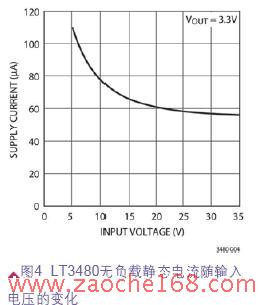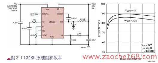 例如:一个应用以 12V 输入工作,产生稳定的 5V 电压同时提供 1A 输出电流,这时 LDO 的效率仅为 41%,浪费 7W 功率,这样即使在 80℃时就需要一个很大的散热器,以防止过热导致故障。而开关稳压器(如图 4 中的 LT3480)能以 90% 的效率工作,外部仅消耗 0.5W 功率。其 TSSOP-16E 封装的 qJA 为 45℃/W,那么这一功耗数字代表温度上升 22.5℃,这使得工业级器件(125℃)可用于温度为 102.5℃ 的环境,而 H 级额定温度的器件可用于温度为 137.5℃的环境。