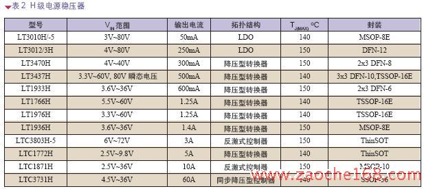 为了满足最苛刻的高温应用需求 (比如:引擎罩内的应用),凌力尔特公司推出了 H 级转换器系列,视具体器件而定,这个系列的器件可在 140℃或 150℃的结温下工作。表 2 全面反映了这个系列器件的性能。转换拓扑包括 LDO、高压单片开关稳压器和控制器。