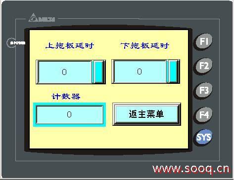 (6)全自动工艺流程:开车启动,恢复原点,阀YV1得电,下托板前进碰到下托板慢进限位SL2后阀YV2得电下托板开始慢进,下托板慢进碰到前进到位限位SL1后执行下托板延时(图六)的设定值,时间到后阀YV1,YV2断电下托板回退,碰到回退到位限位SL3信号后上托板前进阀YV3得电上托板前进,上托板前进碰到上托板慢进SL5限位后,上托板慢进阀YV4得电,上托板慢前进碰到前进到位限位SL4后执行上托板延时(图7)的设定值,时间到后阀YV3,YV4断电上托板回退,上托板回退碰到回退到位限位SL6信号后下托板前进阀YV1再次得电进入下一个循环。