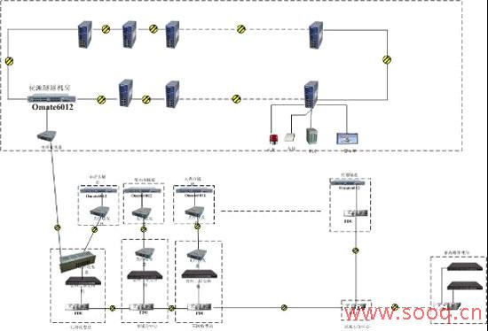 整条高速公路共有隧道18条231个监控传输点。每条隧道主要负责PLC照明、PLC风控、PLC车道指示、火灾报警、车检器、情报板6部分。隧道内至隧道口机房采用双纤环网,隧道口机房至分中心采用FDU设备、隧道口机房至收费站采用光纤收发器,收费站至分中心、服务区采用FDU设备或光纤收发器。主干线网络由9台FDU设备完成。以上为隧道内至隧道口机房采用Omate 6000设备,将隧道内采集以太网数据传输给光纤收发器或FDU设备。其中祝源隧道采用50台Omate 6000设备组成环网,集中表现设备冗余性。