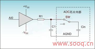 大多ADC芯片内部的模拟输入端都具有一个采样电容Cin,电阻R1对运放输出限流,数倍于采样电容的陶瓷电容C1使得开关SW合上的瞬间,通过C1迅速给采样电容Cin充电。R1、C1的具体数值,与运放的稳定性、建立时间、ADC采样时间、需要的采样精度有关。