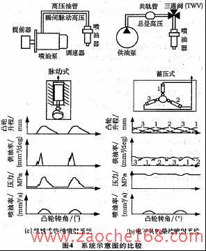 机械柴油喷射与电控共轨柴油喷射的差异主要表现在燃油的供给方式和对喷油时刻的选择上。