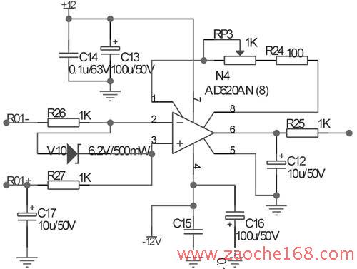 在本系统中,AD620AN用来对系统的电流信号进行放大,系统通过采样电阻把采样过来的信号接入到放大器的输入端,经过放大以后给系统的其它部分进行处理。