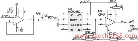 图5中光电隔离器的输入端接入射随器,输出端接一个放大倍数为100的运算放大器,通过调节电位器RP8(也就是调节隔离器的输入端电流)可以使输出电压完全跟踪输入电压的变化。