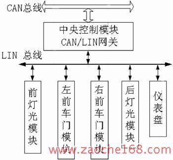 图1给出了卡车车身控制系统的解决方案。电控模块与汽车驱动系统分开有利于保证驱动系统的实时性,这也是汽车内通讯网络分级的一个原因。车身控制系统的中央控制模块也是一个网关,它将CAN网络和LIN网络连接起来。