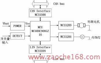 本文选取中央控制模块和灯光控制模块来说明LIN总线的应用。中央控制模块位于驾驶室内,主要检测驾驶室内控制开关的状态,并根据这些控制开关的状态实现相应的控制策略,然后将控制命令通过LIN总线发送给向各子模块。同时通过CAN总线接收上层CAN网络的某些信息。中央控制模块的MCU选用Motorola公司的MC68HC908GZ16,该芯片是一款可靠性高、抗干扰能力强的汽车专用芯片,其内部集成了CAN的控制器并有SCI模块,从而方便了CAN和LIN的开发。中央控制模块硬件原理图如图2所示。其中CAN/LIN接口芯片分别采用Motorola公司的MC33388和MC33399。中央控制模块的POWER单元的作用是将车内24V电压转换成5V供给MCU。DETECT单元作用是采集开关量的状态,将并行的数据转换成串行数据送给MCU。中央控制模块还可以根据不同需求增加驱动单元。在本例中,中央控制模块还完成了驱动车内的内饰灯和雨刷电机的工作,驱动芯片分别选取Motorola公司的MC33286和MC33289。灯光控制模块有两块,主要控制前部和后部的车灯。其中MCU采用Motorola公司低成本单片机MC68HC908EY4,驱动芯片根据车灯所需功率来选取,本设计选取了MC33288和MC33286。