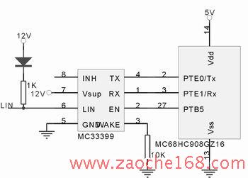 在模块中LIN的硬件电路非常简单,主要是LIN的接口芯片MC33399和MCU的连接,如图3所示。