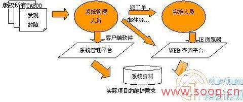 从图中可以看到,软件从系统架构上就完全满足实际项目需求,能够很好的将系统维护规范化。在这个架构中客户端为系统维护人员提供了强有力的支持,通过其强大的功能,能够快速完成系统分析,确定系统问题。而且通过WEB服务器方便一把将系统维护指令下发给设备维护人员,而一般浏览人员也可以通过IE浏览器方便的查阅系统信息。