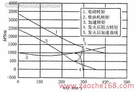 柴油机起动的点火转速,可以根据转矩转速的变化而定,东风4 型机车阻力特性、运动阻力转矩、电机驱动转矩、加速转矩与电机转速的关系如图4 所示。