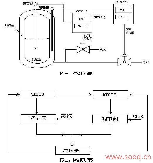 主系统由温度传感器、调节阀、AI808仪表、反应釜组成。AI808-1接受反应釜内热电偶信号,驱动蒸汽调节阀利用人工智能调节反作用功能将蒸汽注入加热总管,加热层温度响应速度快,能很快达到设定温度。但反应釜内温度响应速度慢,故利用AI808-2接受加热层的温度信号作为前馈控制,提前作出反应、调节冷水阀门。将冷水注入总管,把加热用水控制在全适的温度,防止反应釜内的温度滞后而造成主控AI808-1的来回调整,把温度控制在理想位置。
