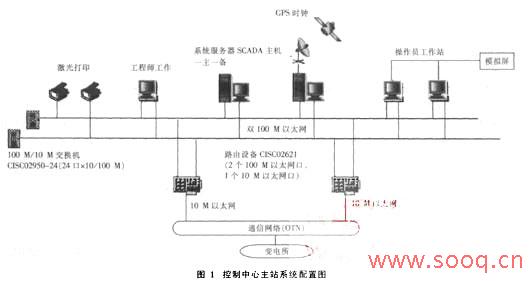 控制中心主站如图1所示,系统硬件由双100M以太网构成局域网及网络接口设备、网桥设备、SCADA主机、调度员工作站、工程师工作站、复视系统、模拟盘系统设备、打印服务器及打印机、UPS电源、电池柜、配电柜等设备构成。