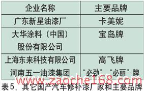 中国轿车修补漆正式进入市场是从2000年之后开始,其中较为知名的是常州福莱姆公司。目前国产汽车修补漆生产企业主要集中在广东、江苏二省,其中广东的实创、邦尼、联合;江苏的福莱姆、普兰纳等国产品牌已经在市场上具有较大的影响,这些企业不但有自己的色母系统,轿车修补所需的各种材料也较齐全,产量和产能居国产修补漆主导地位,目前自主品牌已占修补漆市场的75%~80%。主要厂家见表3和表5。