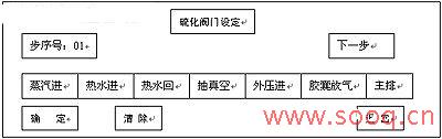 ·按"阀门设定",画面将刷新如图5所示,根据工艺要求设定每步对应的阀门动作,检查无误后按"返回"键回到"编辑界面",输入操作者代号,按"确定"键。