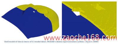 图2 BMW X3减振器支座外壳模型(蓝色),MODAW部分描绘图(黄色)