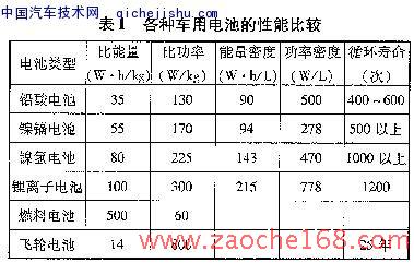 到目前为止,电动汽车车用动力蓄电池经过3代的发展,已取得了突破性的进展。第1代是铅酸电池,目前主要是阀控铅酸电池(VRLA),由于其比能量较高、价格低和能高倍率放电,因此是目前唯一能大批量生产的电动汽车用电池。第2代是碱性电池,主要有镍锅、镍氢、钠硫、铿离子和锌空气等多种电池,其比能量和比功率都比铅酸电池高,因此大大提高了电动汽车的动力性能和续驶里程,但其价格却比铅酸电池高。只要能采用廉价材料,电动汽车用锉离子电池将获得长足的发展,目前关键是要降低批量化生产的成本,提高电池的可靠性、一致性及寿命。第3代是以燃料电池为主的电池。燃料电池直接将燃料的化学能转变为电能,能量转变效率高,比能量和比功率都高,并且、可以控制反应过程,能量转化过程可以连续进行,因此是理想的汽车用电池。表1为各种车用电池的性能比较。