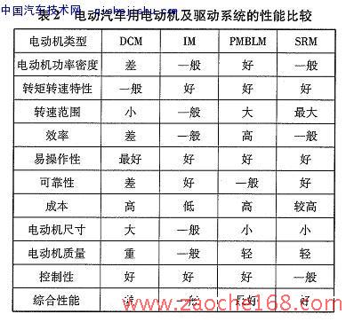 目前,电动汽车用电动机主要有直流电动机(DCM)、感应电动机(IM)、永磁无刷电动机(PM-BLM)和开关磁阻电动机(SRM)4类,其性能对比见表2。