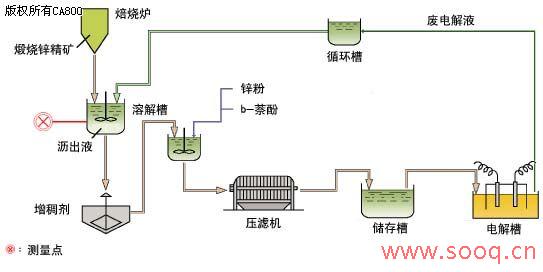 | 应用简介 电解精炼锌和空气清洗沥出液的pH值测量防止(电极)结垢 大部分1#锌都是电解精炼得到,这不仅可得到高纯度锌,还可以回收原料中的贵重金属。在湿法精炼中,首先煅烧锌精矿原料,然后在硫酸中溶解以除去杂质。该过程叫过滤,沥出液的pH值控制很重要。沥出液中含有石膏和杂质,能使电极结垢。这会影响pH值的稳定测量,因此需要至少每周定期清洗一次。超声波自清洗系统的pH计能连续自动清洗,因此可降低维护频率,设置为每个月或每两个月自动清洗一次。 ![]() 预期效益 - 保证稳定连续测量pH值 - 降低运行成本 - 免除手工清洁的工作 流程概述 在焙烧炉中煅烧精矿,然后在溶解槽的稀硫酸(消耗电解液)溶液中溶解。 ZnO+H2SO4->ZnSO4+H2O 此外,煅烧产物中的铁和所含其他成分也会溶解。因此,加入锰、石灰或其他添加剂可以使这些杂质沉淀并除去。 FeO+添加剂->Fe2O3(沉淀) pH值控制对锌完全溶解和杂质充分沉淀至关重要。沥出液由压滤机过滤,以除去杂质,并将滤出液送入电解槽,在这里电解产生锌。 解决方案 测量系统 四线pH测量系统(超声波自清洗系统) 传感器 KCl可填充型 pH传感器(特氟隆材质接头) PH8EFP-☐☐-TN-TT1-N-T*A/TF 支架 带沉入式支架的超声波自清洗系统 PH8HS-PP-☐☐-T-JT-JP*A/MS3 端子箱(需要时) PH8TBG*A 四线pH转换器 PH400G-☐-EA*B ![]() 公共条件 PH400G 四线制pH转换器 电源: 88~132/176~264 V AC, 50/60 Hz 功耗: 约为8.5 VA 沉入式超声波自清洗式支架 喷射清洗用空气 气压: 200~400 kPa 耗气量: 100~300 Nl/min 注意事项 - 连续超声波清洗 由于沥出液是强酸性溶液,其pH测量值不受空气超声波清洗影响。因此可同时进行测量和清洗。 - 其他应用 自清洗系统可用于其他冶炼工艺,如铜、锰、镉等。 现场数据 工艺条件 测量点: 溶解槽中的沥出液 温度: 80℃ pH值: pH 1.5 ± 0.2 锌: 约160 g/l 硫酸: 2~3 g/l 石灰: 饱和溶液 在安装超声波自清洗系统之前,每周至少需要完成一次手工清洗。连续式超声波自清洗系统使用沉入式支架,使维护频次降低到每一个/两个月一次。为确保稳定测量,pH传感器使用特氟隆液接部件,KCl流出量高于陶瓷液接部件。 |