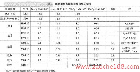 2005年欧洲车用发动机已开始实施欧Ⅳ排放法规,其对柴油机提出了更为苛刻的要求。在一些国家和地区,中重型车用柴油机的排放在发动机对环境排放贡献度中要达到70%左右,因此中重型车用柴油机的排放一直是内燃机排放控制领域的重点。表1为欧洲重型柴油机排放限值的演变,其中NOX排放限值自排放法规实施20年以来下降了81%;PM排放限值15年以来下降了97%。