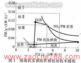此种路线在欧洲采用较多,简称欧洲路线。对于大多数制造商,发展现有的发动机技术是首选的途径。有几种可选择的方案:如先在发动机机内处理NQx,再处理PM;或者两者都进行后处理。后者存在一个污染源回收的处理问题。没有EGR系统,在发动机机内处理NOx是非常困难的,并且燃油消耗更高。因此,制造商一般采用在发动机机内减少PM排放、在废气中处理NOx的措施。