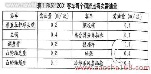 一般供油间隔时间为l0 h或20h,全年的耗油量必须小于油箱的容量。根据客车润滑油消耗的规律及KFU2-40集中润滑系统的特点,我们确定了PK6112CD1客车每个润滑点每次需油量(见表1)。