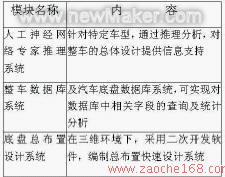 客车底盘总体设计系统,如表1所示,包括人工神经网络专家推理模块、整车及底盘数据库模块、底盘总布置设计模块、整车动力学仿真模块等四个功能模块,均集成并运行于UG环境之下。考虑到实际使用的需要,动力学仿真、整车及底盘数据库模块均自成体系,可单独运行。
