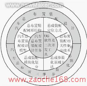根据上面的论述,结合客车总布置设计任务,以客车总布置参数化模型和三维CAD软件的二次开发为基础,通过总布置装配树形结构的确定、总成的模块化划分、装配定位方式的确定,充分应用装配知识和装配相关性驱动技术,从而构建起基于装配规则和三维CAD技术的客车总布置装配设计的技术应用方案(如图3)。