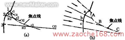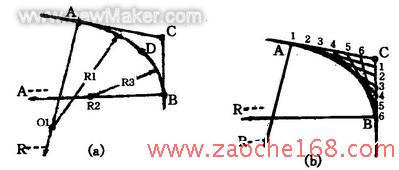 车身的造型还应遵循一定的曲线规律,以获得良好的光学效果。所遵循的曲线规律就是光滑的车身表面。所谓光滑的车身表面,是指车身表面某区段上每一点只有唯一的曲率半径。这可以运用“车身制表面”的方法获得。如果不遵照车身制表面的方法,而是采用一般圆弧的简单方法设计车身表面,所得的连接结果只能是分段光滑的,见图4。