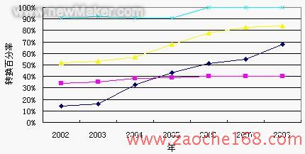 以减少VOC和有害重金属为代表的环保型漆前处理材料和环保型涂料不断得到推广应用,在欧美,新的涂装生产线已经全部普及应用环保型材料,日本近几年也加快了推广速度。在国内,国外独资及合资的涂料生产企业具备可在国内加工生产水性中涂和水性面漆的能力(部分国内自主汽车涂料厂近几年进步也较快,但与国际水平仍有较大差距,还不能满足汽车行业的需求),欧、美、日等国的汽车合资企业和我国几大汽车公司新的车身涂装生产线多已经考虑应用水性中涂及水性面漆的可能性,有的已经开始应用水性中涂和水性面漆底色[1]。总体上就车身涂装而言,前处理及底漆应用各国水平基本相当。中涂和面漆,北美高固体份涂料、粉末涂料较普及,水性涂料近几年也开始应用。欧洲水性涂料应用较普遍,一代中涂(水性、粉末)已经开始被低成本转换概念(LCCC)中涂(低膜厚水性中涂和低膜厚粉末)所替代,烘干规范和溶剂型完全相同(晾干20℃/6~8分钟、升温6~8分钟、保温160℃/12~15分钟),外观质量优于第一代;宽施工工艺窗(50%~80%RH、20~32℃)的金属和塑料通用的水性底色开始应用、底色喷涂和罩光漆之间不需要红外烘干和冷却,可以降低设备和生产运行成本;2K高固化体份溶剂型或水性清漆应用比较普及,适应VOC排放要求的同时,抗擦伤性能进一步提高;粉末罩光漆应用不断改进,已经成熟,将进一步推广。日本水性涂料应用刚刚起步,高固体份涂料和粉末涂料应用较少。中国涂料应用水平主流与日本相当,但有些小汽车厂相对落后。目前,车身涂装降低VOC效果最显著的是水性面漆底色的应用,欧、美、日从溶剂型底色向水性底色转换及预测见图1。